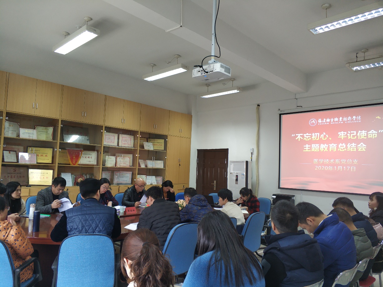 为进一步学习贯彻习近平总书记在“不忘初心、牢记使命”主题教育总结大会重要讲话精神,巩固深化主题教育成果,医学技术系党总支于2020年1月17日下午召开“不忘初心、牢记使命”主题教育总结大会。学校第六巡回指导小组组长、校党委委员、副校长黄铭珊同志莅会指导。会议由医学技术系党总支负责人邱滚忠同志主持,医学技术领导班子、全体党员教师参加会议。