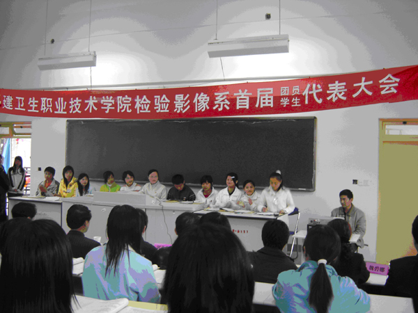2006年3月21日下午3:00,检验影像系第二阶梯教室内掌声雷动,喜气洋洋。共青团检验影像系首届团员代表大会、检验影像系首届学生代表大会开幕式在这里举行,完成了检验影像系团总支、学生会的组建工作。院领导廖伟坚副院长、教务处林复生副处长、学工处黄铭珊副处长、医学基础部苏爱华书记、护理系学生代表、系领导马少宁主任、兰宝金书记、郭礼坚副主任、办公室秘书吴星禄老师、临检生化教研室魏碧娜主任、微寄教研室郑韵芳主任、物理影像教研室曹家龙主任出席了开幕式。