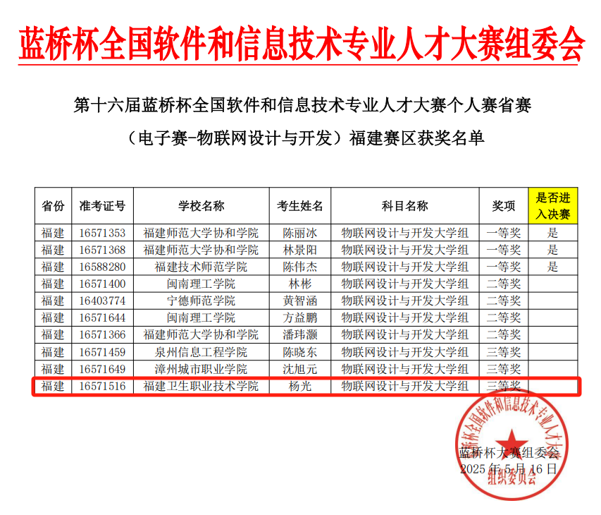 近日由工业和信息化部人才交流中心主办,国信蓝桥教育科技股份有限公司、福建江夏学院承办,第十六届蓝桥杯全国软件和信息技术专业人才大赛个人赛省赛(电子赛)福建赛区赛事圆满落幕。此次比赛汇聚了众多本科高校的优秀学子,竞争异常激烈。在激烈的角逐中,我校医学技术与工程学院的方孔炜、杨光同学发挥出色。其中,方孔炜同学荣获“EDA设计与开发大学组”赛项三等奖,杨光同学荣获“物联网设计与开发大学组”赛项三等奖。