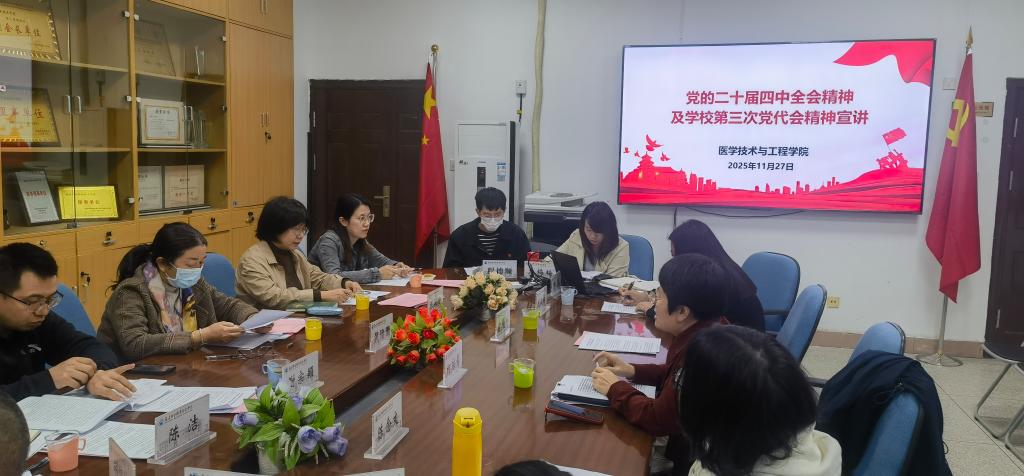 为推动党的二十届四中全会精神与学校第三次党代会精神入脑入心,进一步统一思想、凝聚合力,引导全院师生将智慧和力量汇聚到中央决策部署与学校发展大局中来。11月27日,校党委委员、副校长黄铭珊赴医学技术与工程学院开展专题宣讲。医工学院领导班子成员、党支部书记、辅导员代表、教研室主任参加会议,会议由学院党委书记柯琼莺主持。