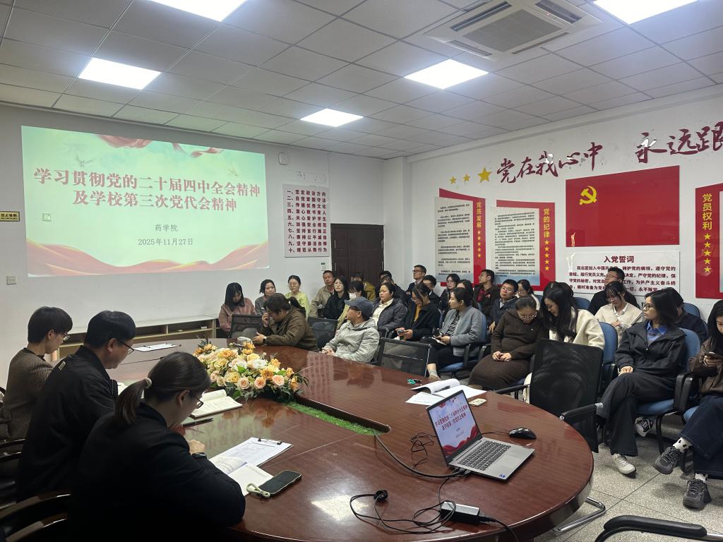 叶海立足药学院实际,重点阐述全会关于“建设现代化产业体系”“加快高水平科技自立自强”“扩大高水平对外开放”等内容,深入解读校党代会关于学校未来五年发展战略任务,并对药学院接下来的工作做了部署。他指出,将进一步明确学院发展的核心任务,突出药学院特色和优势,在争创新“双高校”、科技成果转化应用、实现高质量发展等方面拿出更实的举措。