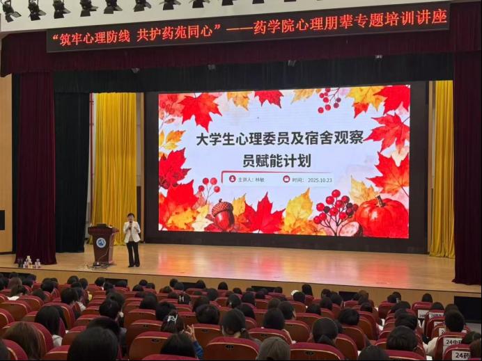 10月23日,药学院邀请了福州大学心理学专家林敏老师到校开展以“筑牢心理防线,共护药苑同心”为主题的心理朋辈专题培训讲座,药学院全体心理委员、宿舍观察员及心理朋辈志愿者共400余人参加。