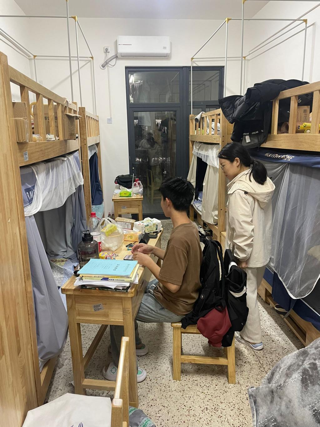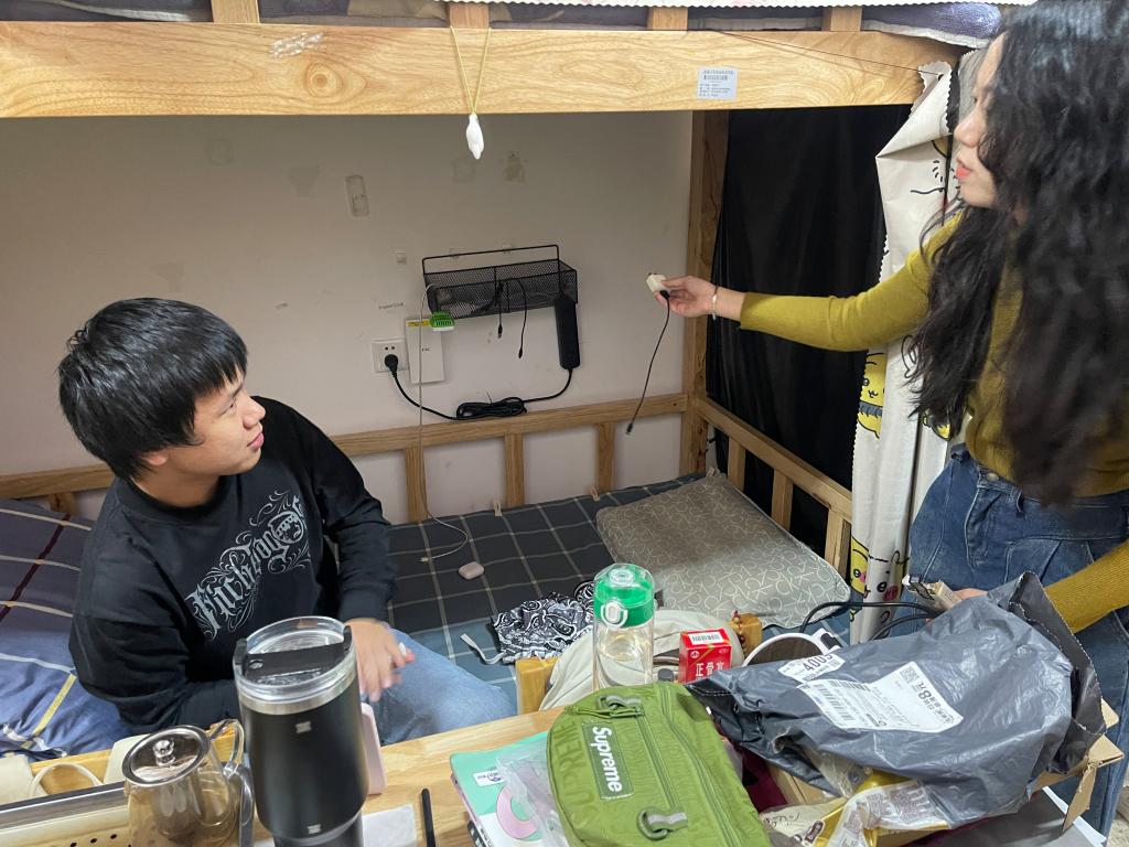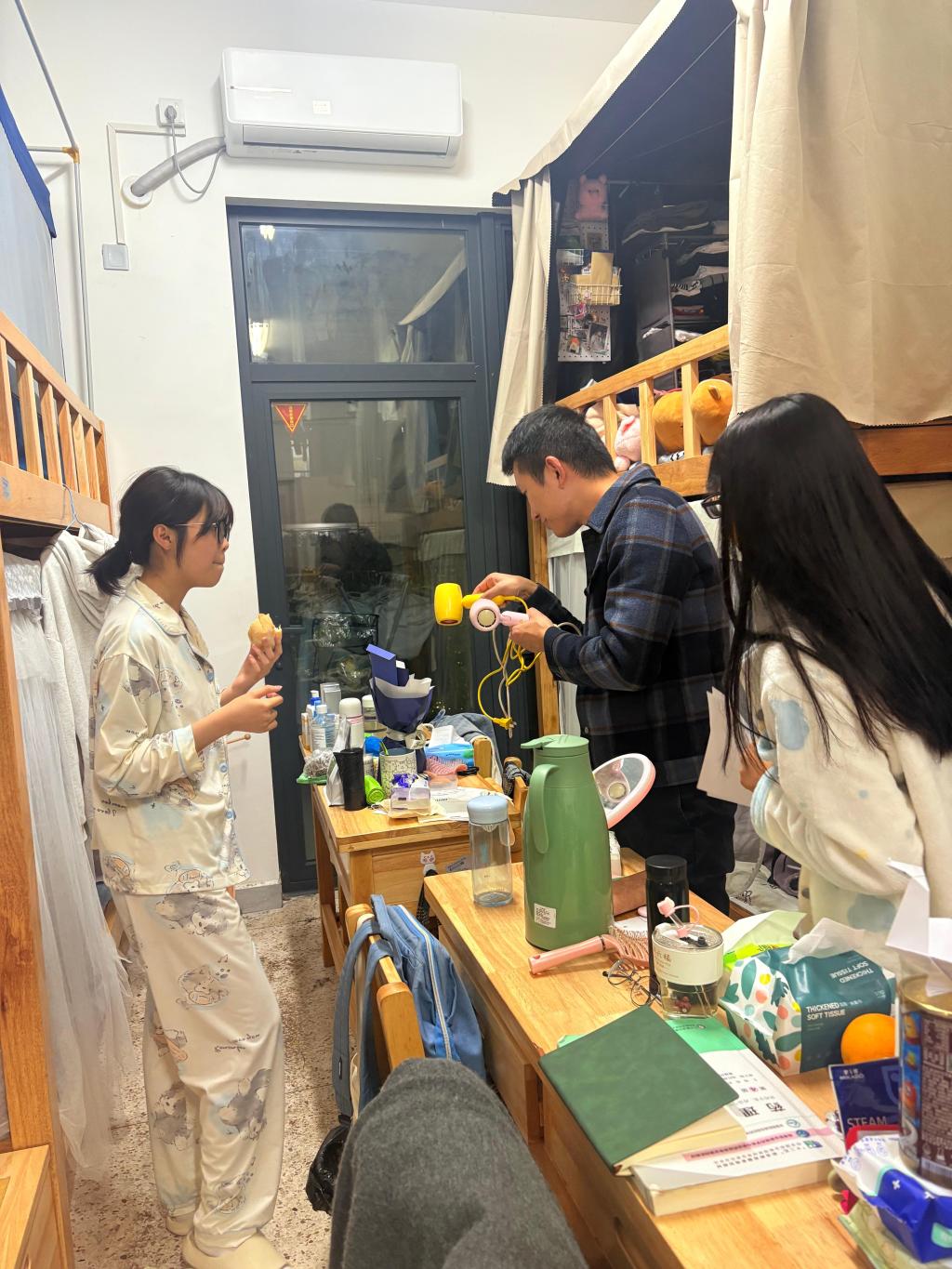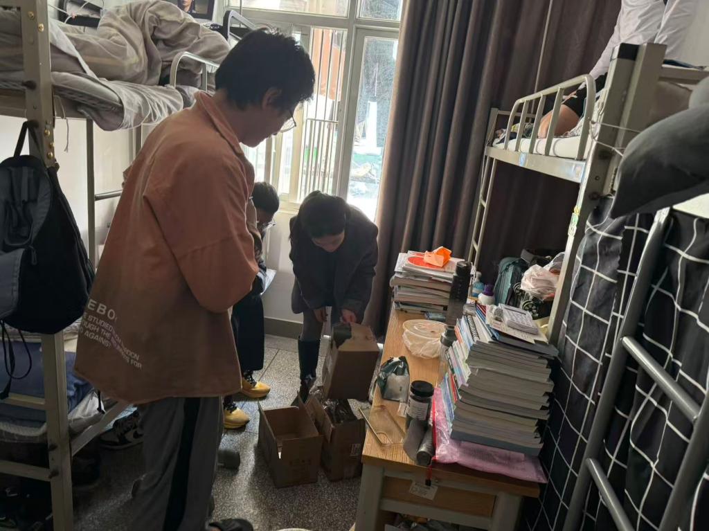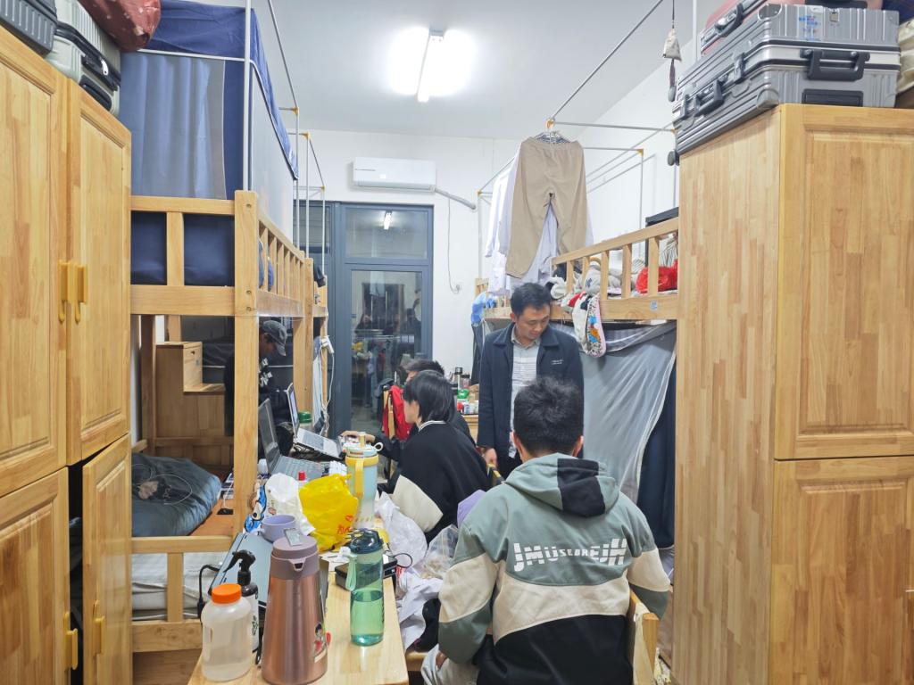 “最近气温变化大,要注意添衣保暖,宿舍常通风。”每走进一间宿舍,学院领导都亲切询问同学们的日常生活与学习情况。检查小组重点关注用电安全,对违规电器进行排查,同时向同学们普及安全知识。