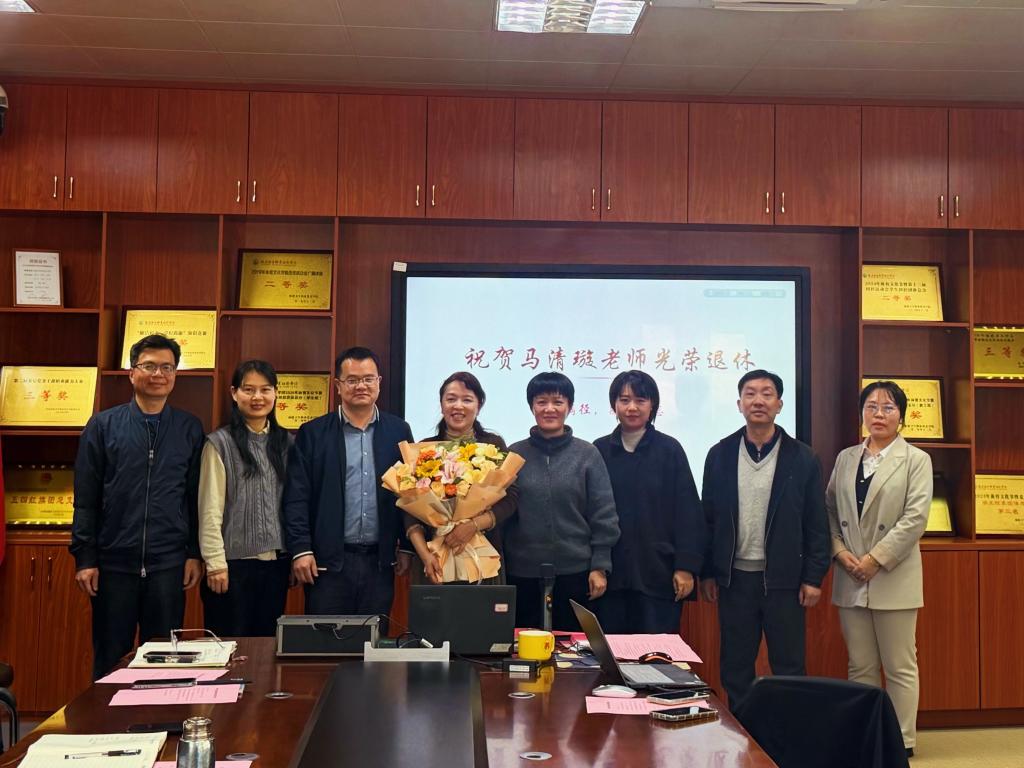 最后学院院长邓元荣代表学院向马清璇老师颁发了退休纪念章并赠送退休纪念品,感谢她多年来为学院教育事业付出的心血与贡献。